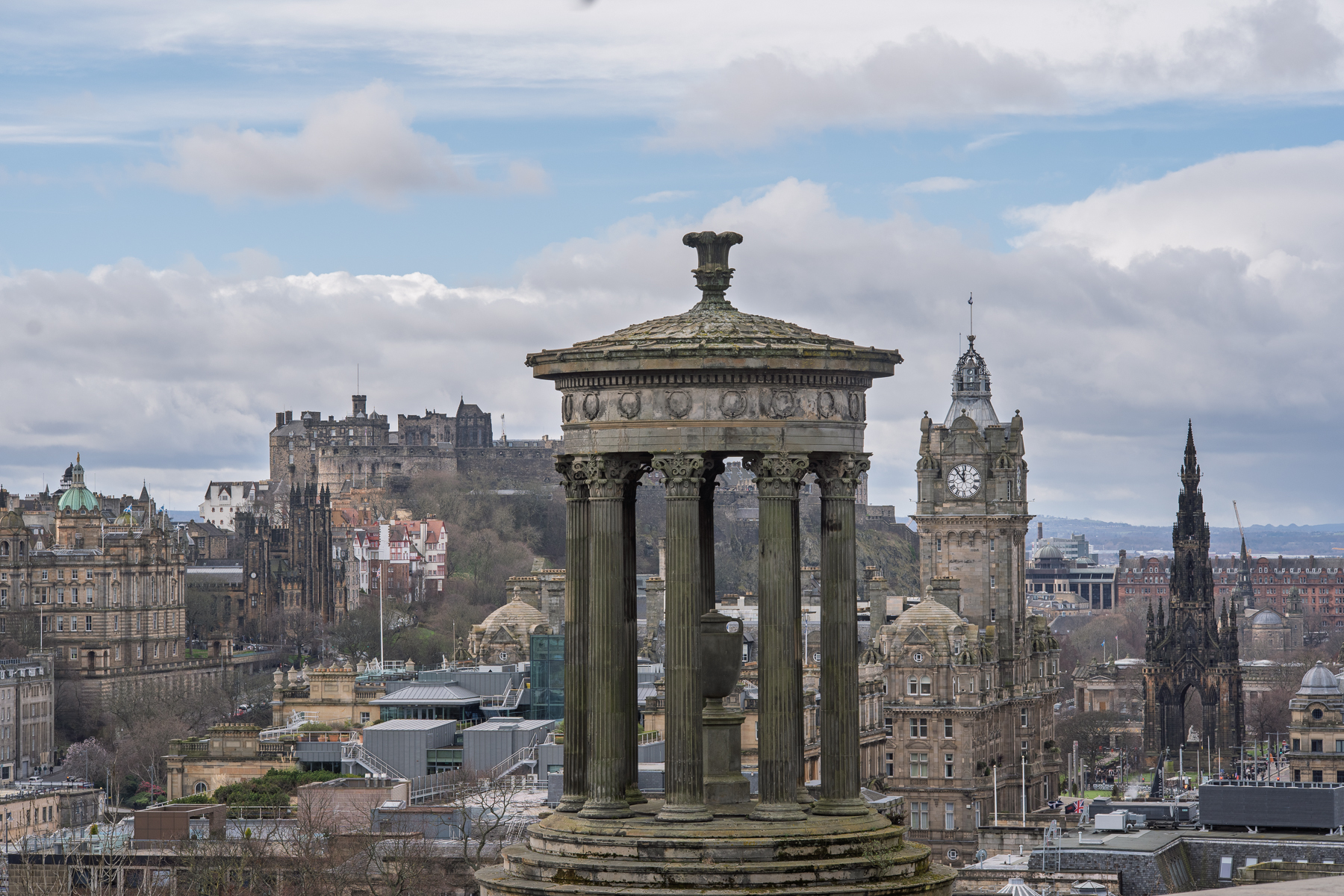 The Scottish National Monument is one of several fascinating buildings on the top of Calton Hill. You can see for miles in every direction – across the city and beyond