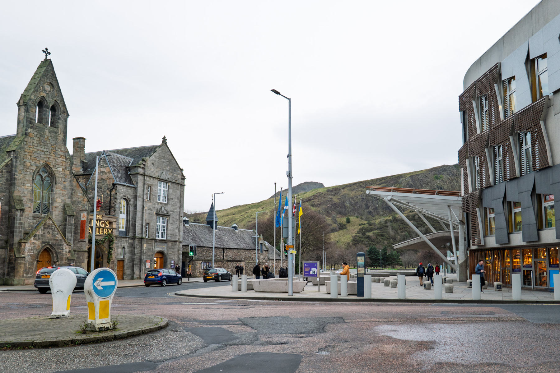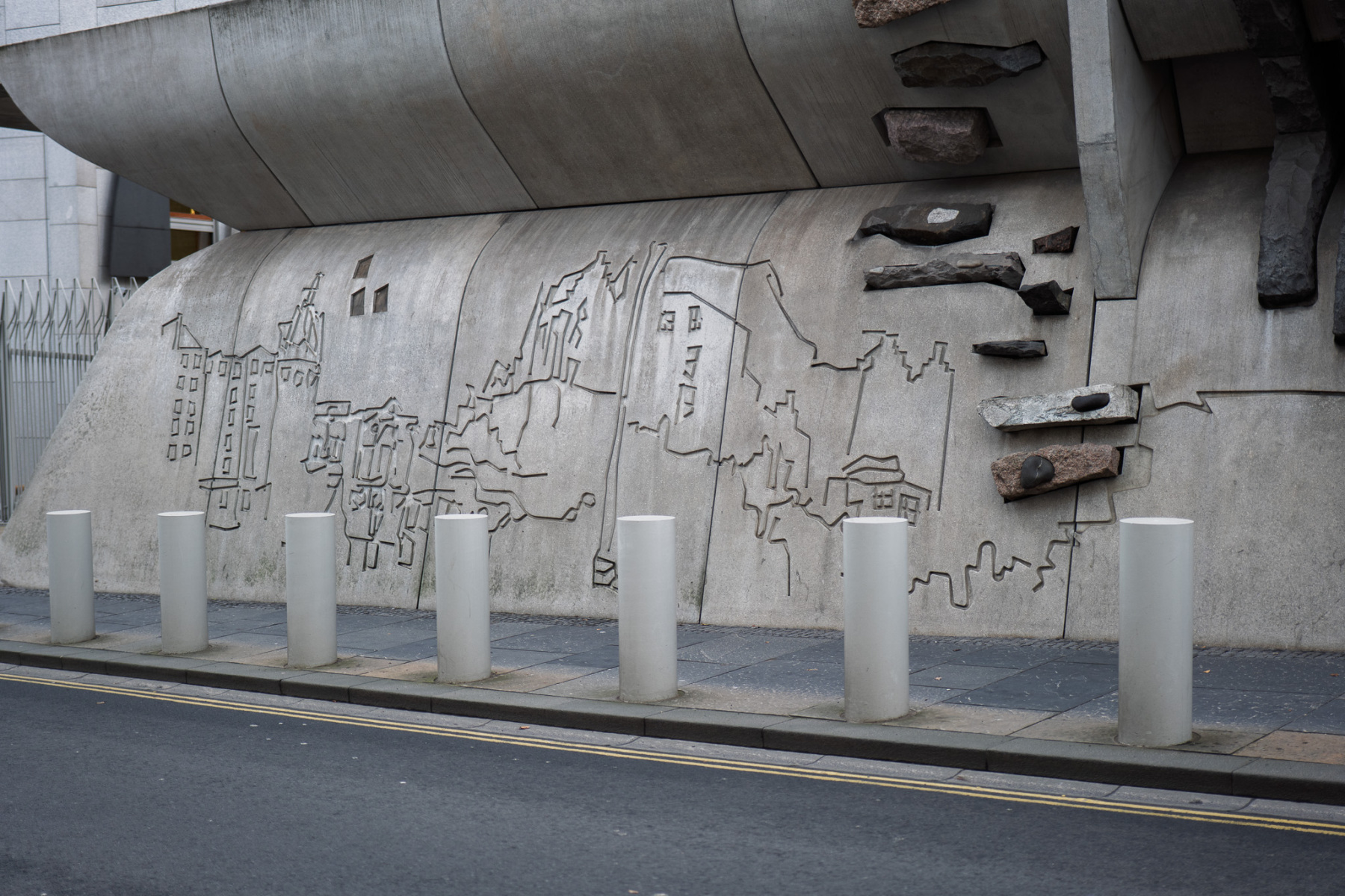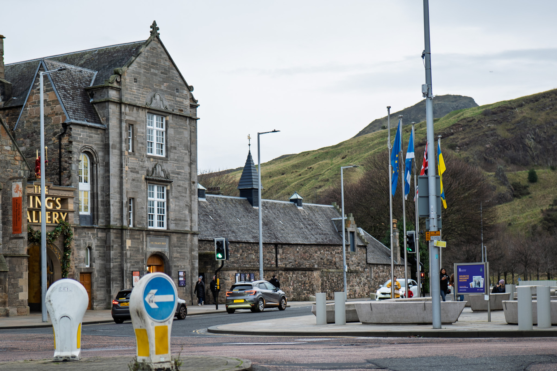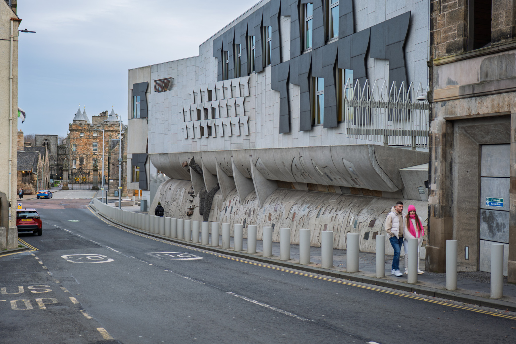 Holyrood Palace and the Scottish Parliament sit next to each other at the foot of the Royal Mile – one mile from Edinburgh Castle which sits at the top of the Royal Mile. The Palace was built in the 16th century beside Holyrood Abbey. The Parliament building was opened in 2004, although the Scottish Parliament had been meeting in the Church of Scotland Assembly Hall on the Mound since the Parliament was reconvened in 1999. No photographs are allowed inside the Palace and photography is restricted inside the parliament, but yo;u can find many images online from both buildings. The slide show on this page shows both buildings from the outside and some shots of the surrounding area.